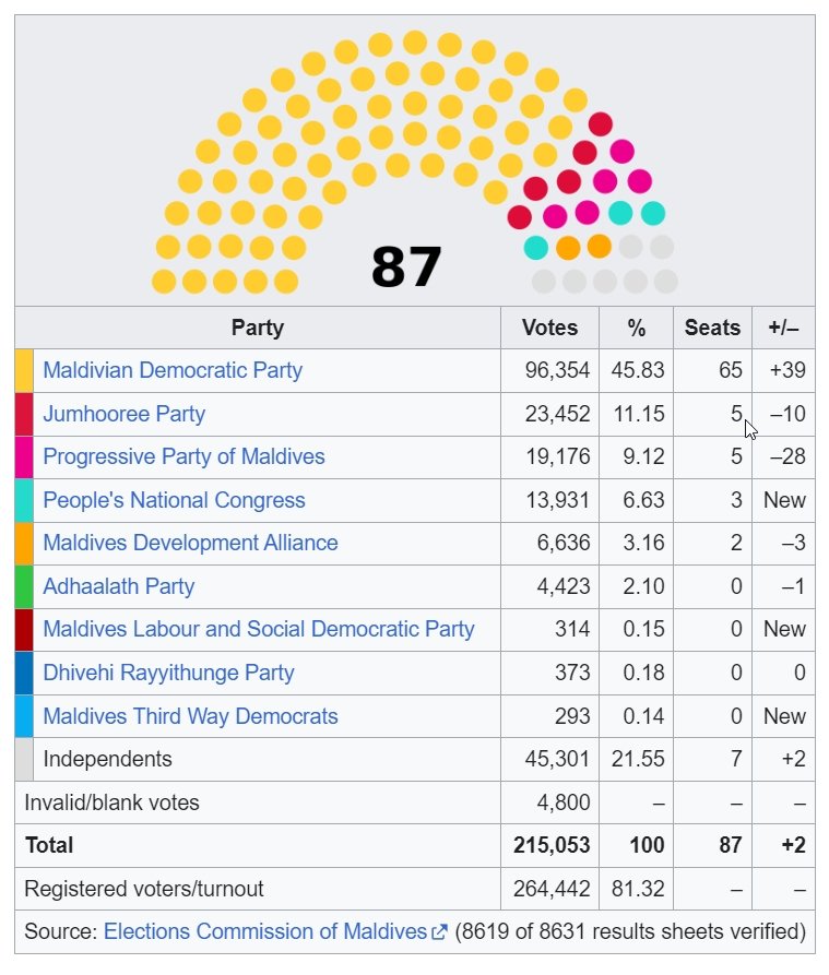 Zákonodarnú moc na Maldivách zastupuje jednokomorový parlament známy ako Ľudová Majlis, ktorý má 87 členov volených na päť rokov. Počet zástupcov z každého volebného obvodu závisí od celkovej populácie daného obvodu. Posledné parlamentné voľby sa konali 6. apríla 2019.